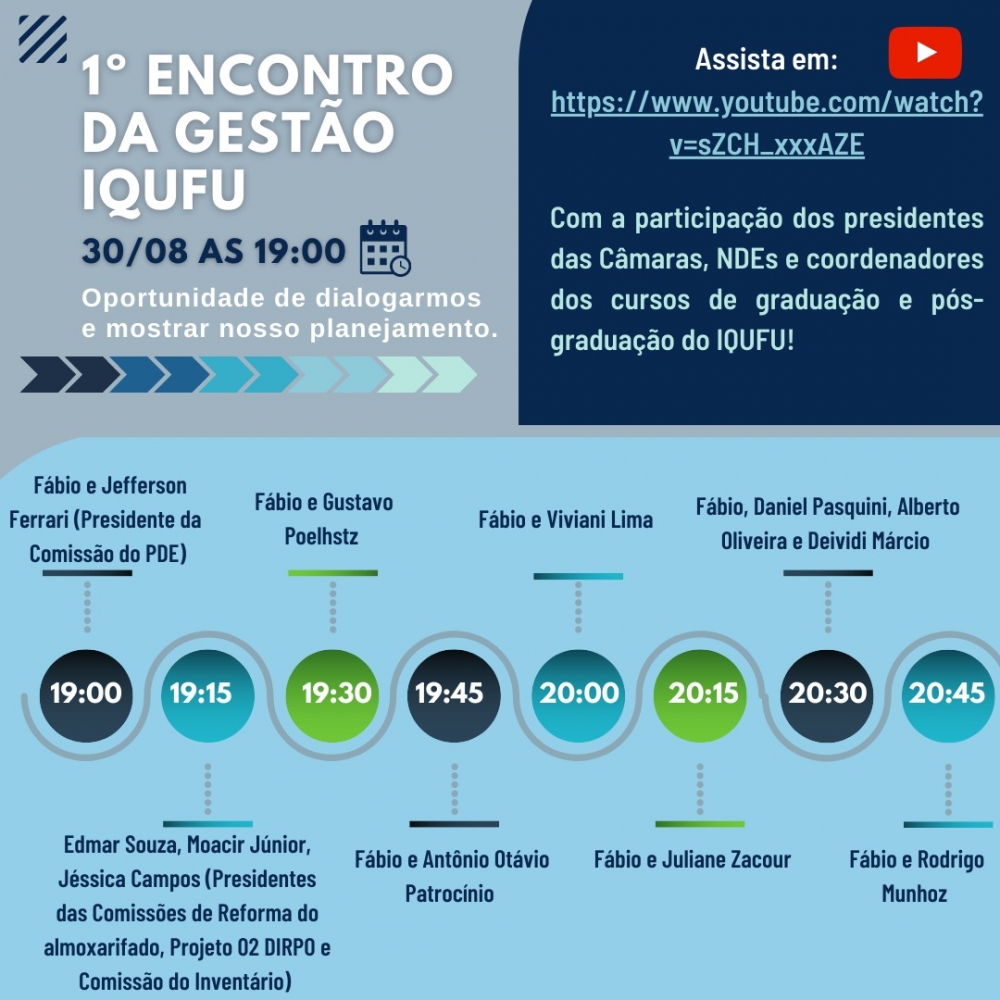 Apresentação, ao vivo, com a participação dos presidentes das Câmaras, NDEs e coordenadores dos cursos de graduação e pós-graduação do IQUFU.