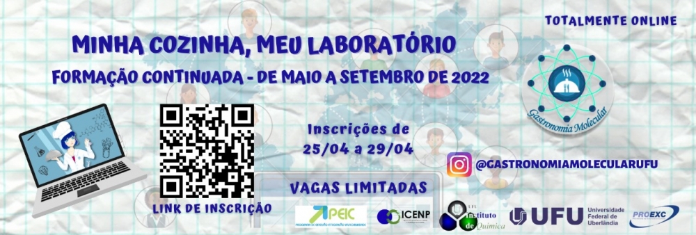 A Formação Continuada: "Minha cozinha, meu laboratório" será realizada online e gratuita com encontros quinzenais aos sábados a partir das 9h e duração máxima de 3h por dia no período de maio a setembro de 2022. Será realizada pela plataforma google meet ou Youtube, com carga horária total de 75h sendo com atividades síncronas 33h, assíncronas 22h e 20h de aplicação.