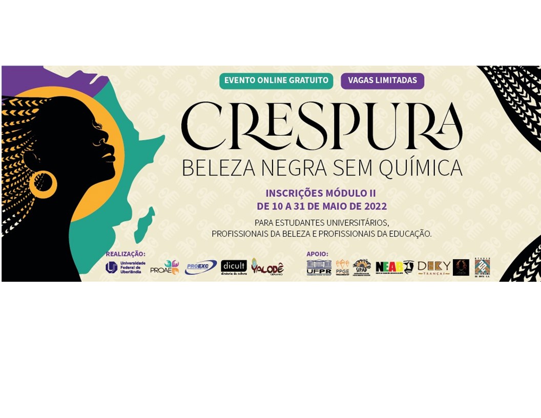O Coletivo Yalodê Geplafro (COLETIVO DE ESTUDO E PESQUISA EM POÉTICAS AFROLATINOAMERICANAS E EDUCAÇÃO PARA AS RELAÇÕES ÉTNICO-RACIAIS), com apoio da Universidade Federal de Uberlândia (UFU), do Instituto de Química (IQUFU) e da Pró-reitoria de extensão e Cultura (Proex), abrem vagas para participação no curso virtual CRESPURA/2022.