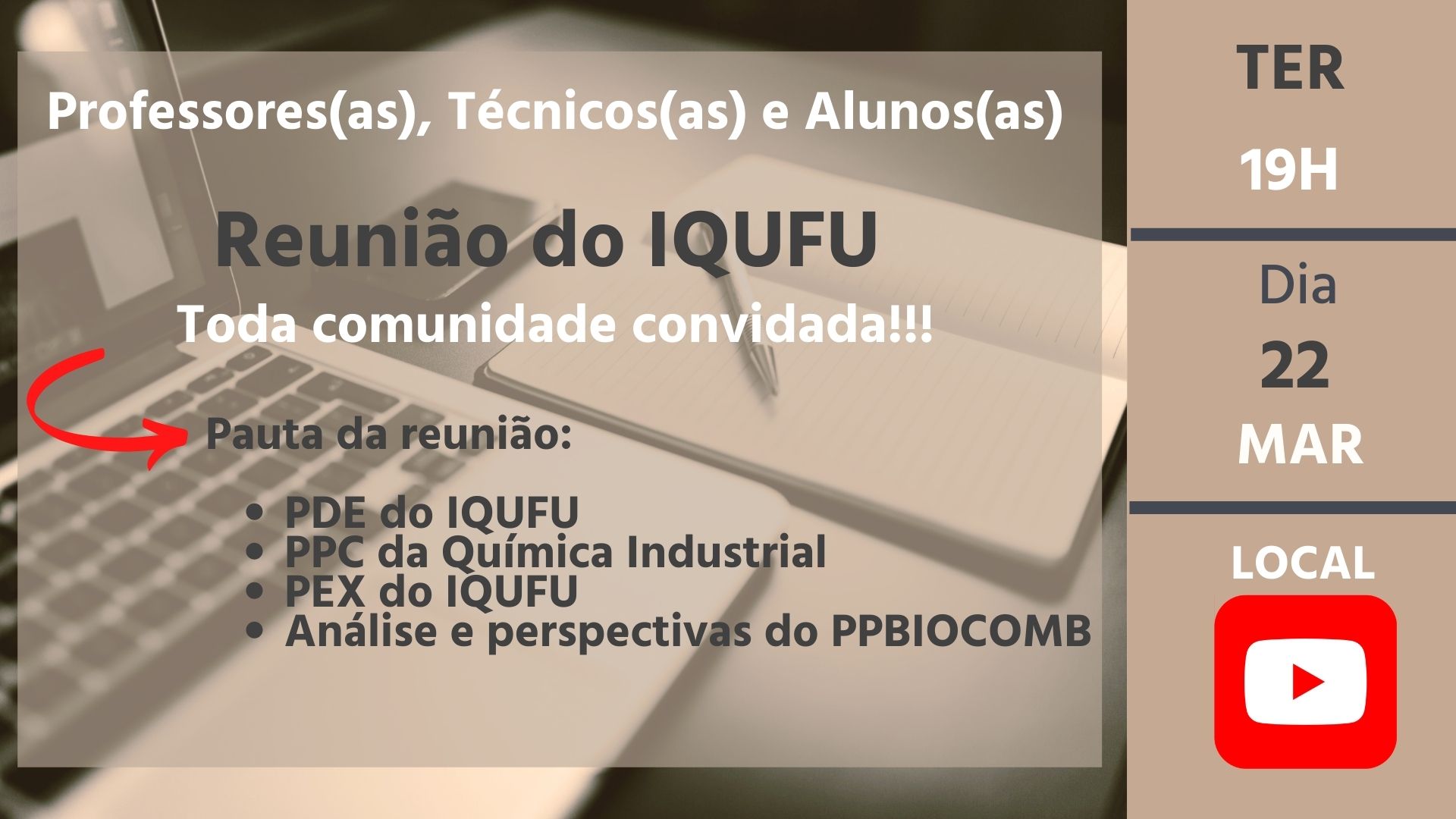 Aproveito a oportunidade para convidar a todos(as) para uma reunião na terça-feira dia 22/03/2022 as 19h, na qual teremos as seguintes apresentações de interesse de toda comunidade do IQUFU: