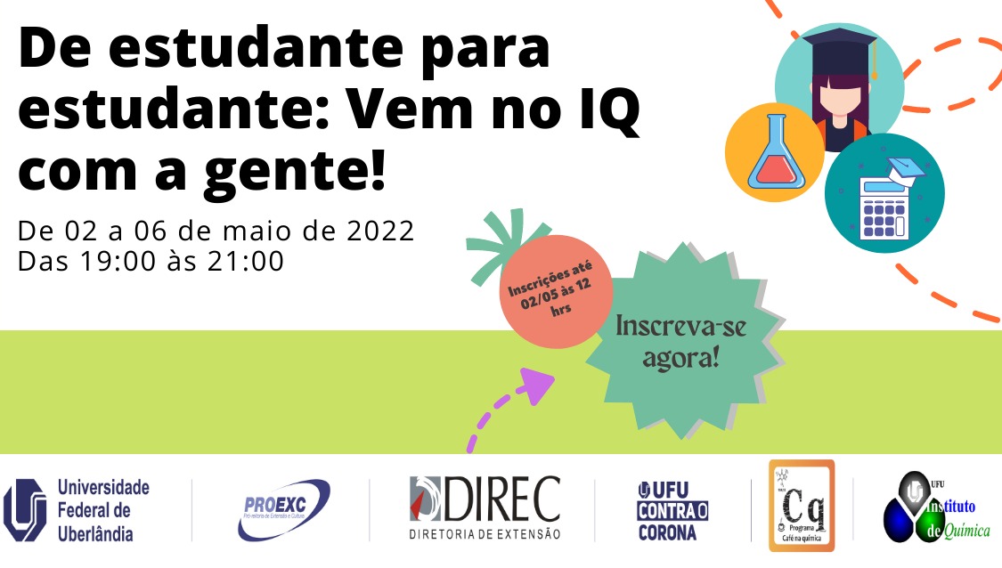 É com muita satisfação que a Comissão Organizadora, em nome dos docentes/técnicos administrativos do Instituto de Química UFU, vem convidar-lhes para o Evento De estudante para estudante: Vem no IQ com a gente!