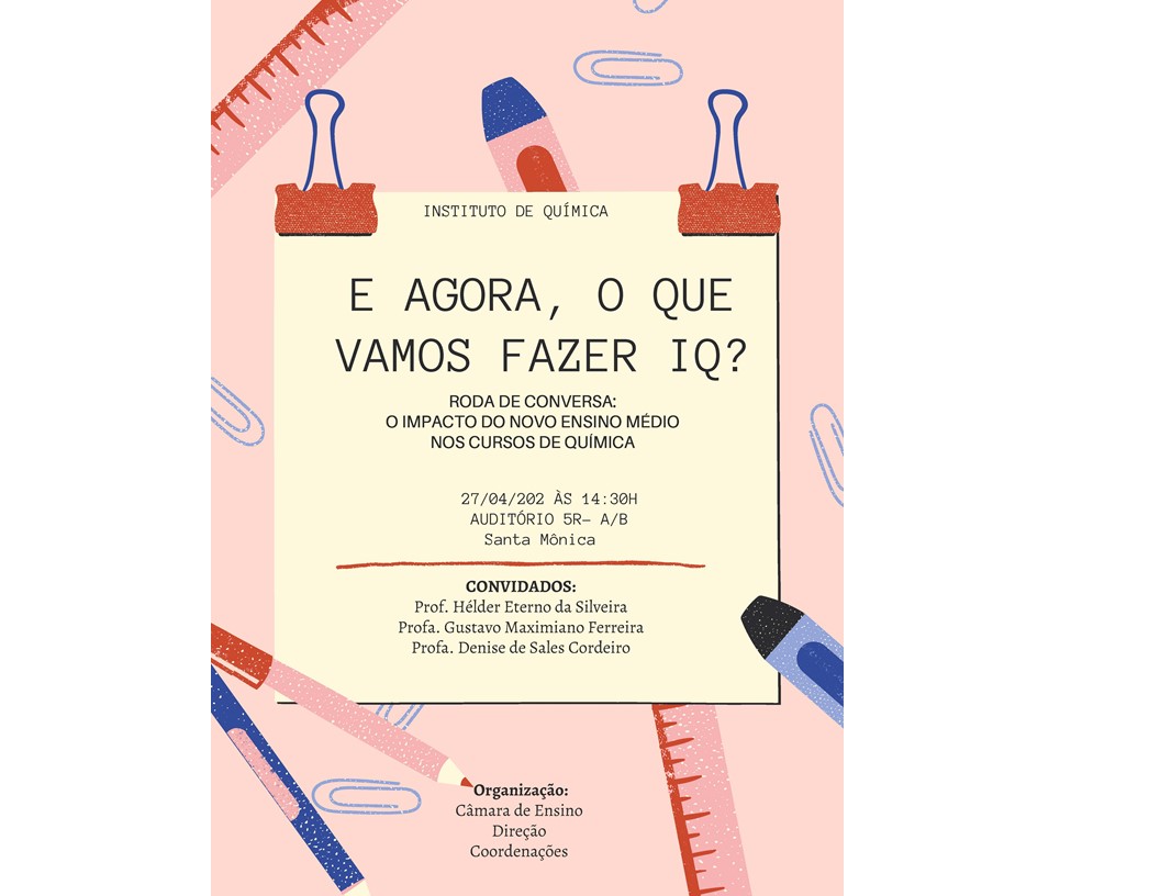 O objetivo desta roda de conversa é dialogar sobre o impacto das diretrizes atuais do Novo Ensino Médio, ou seja, a organização dos componentes curriculares na Educação Básica a partir da Base Nacional Curricular Comum (BNCC) e quais as consequências na matriz orçamentária do Instituto de Química.