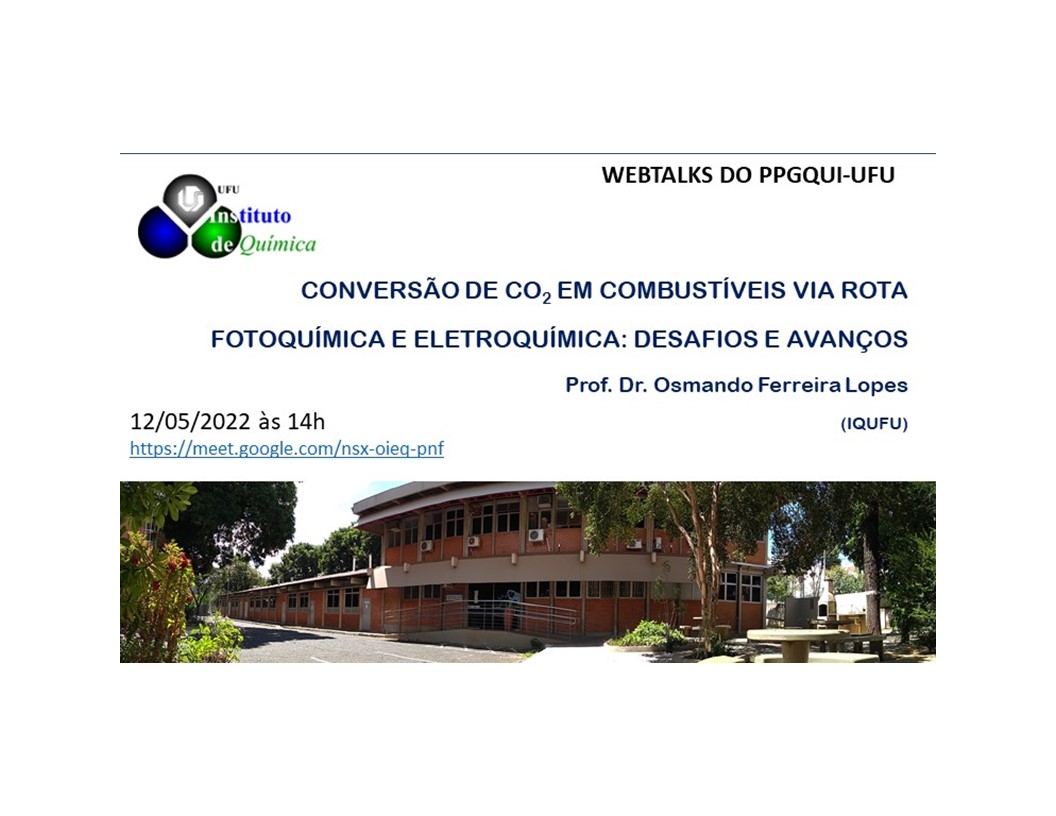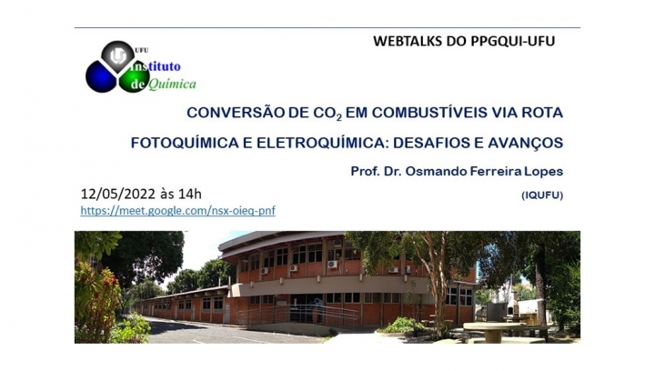 - "Conversão de CO2 em combustíveis via rota fotoquímica e eletroquímica: desafios e avanços" ministrado pelo Prof. Dr. Osmando Ferreira Lopes (PPGQUI/IQUFU).