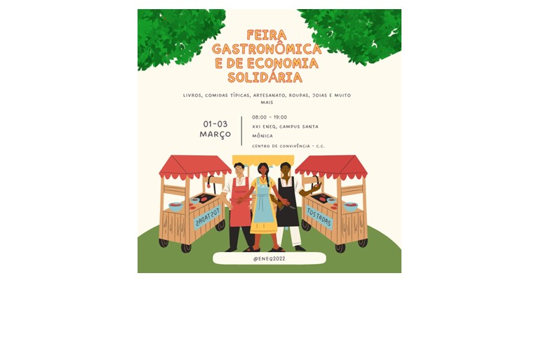 Neste evento contaremos com a Feira Gastronômica e de Economia Solidária, a ser realizada no Centro de Convivência do Campus Santa Mônica da Universidade Federal de Uberlândia (UFU).