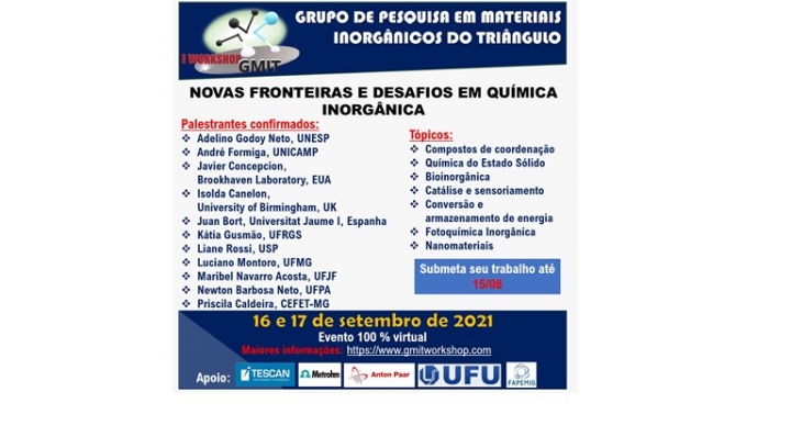 O Professor do PPGQUI Antônio Otávio Patrocínio está na organização do I Workshop GMIT (Grupo de Pesquisa em Materiais Inorgânicos do Triângulo) com o título "Novas Fronteiras e desafios em química inorgânica", o qual contará com a participação de pesquisadores nacionais e internacionais.