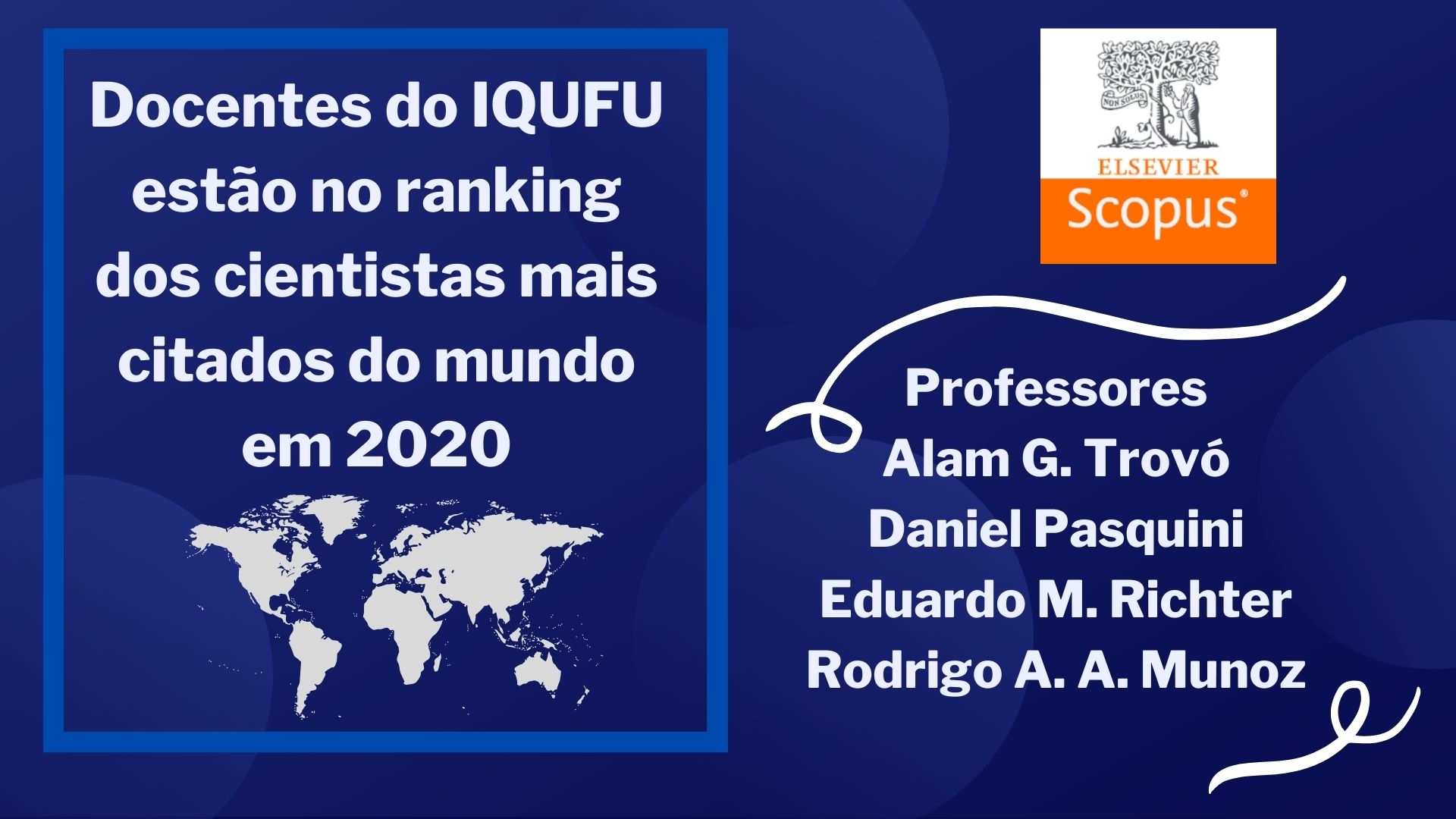 Ranking mostra os cientistas que estão entre os 100 mil mais citados no mundo. A UFU tem 13 docentes nessa lista, dos quais 4 são do IQUFU: Alam G. Trovó; Daniel Pasquini, Eduardo M. Richter e Rodrigo A. A. Munoz .
