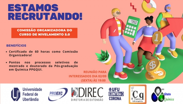 O nosso Curso de Nivelamento de Química e Matemática - versão 5.0 está chegando! Você discente da graduação ou da pós-graduação, venha ser voluntário/a nesta ação.