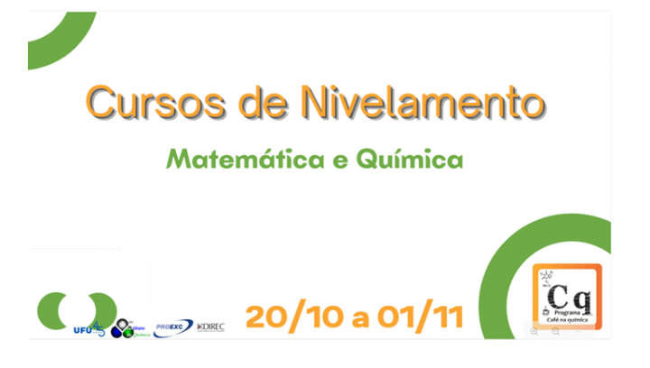 É com muita satisfação que a Comissão Organizadora dos Cursos de Nivelamento em nome dos/as docentes/técnicos/as administrativos/as do Instituto de Química UFU, vem convidar-lhes para a Abertura do Evento Cursos de Nivelamento Química e Matemática 2025 - versão 10.0 e Recepção aos calouros do Curso de Química Industrial.