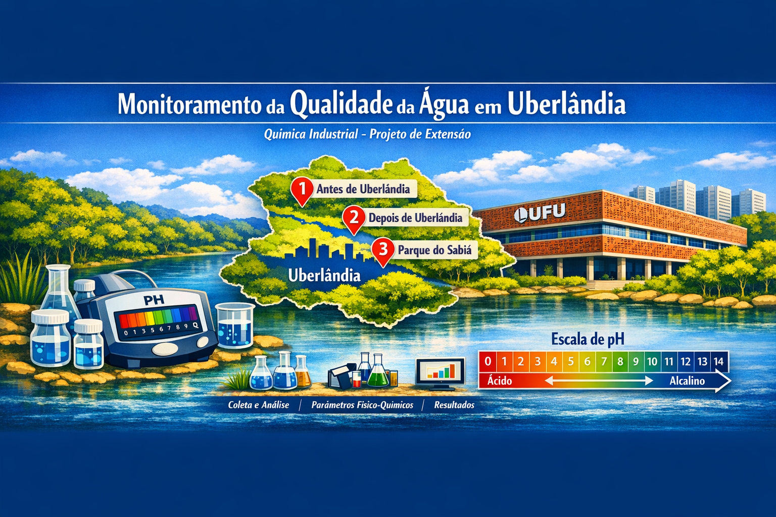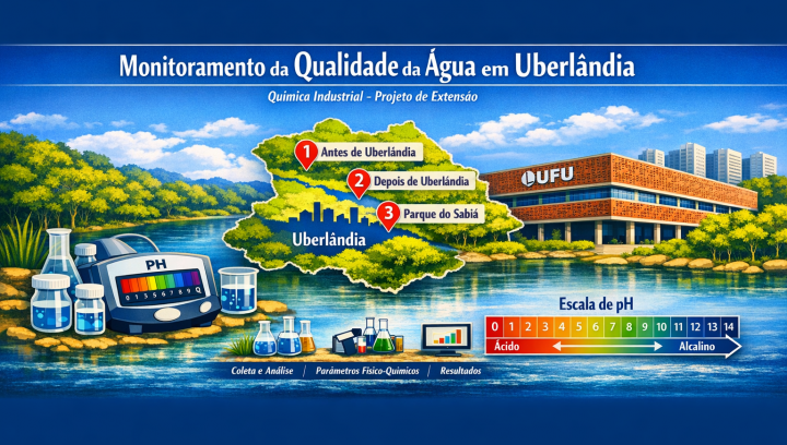 No âmbito da Componente Curricular de Extensão (ACE), este projeto passa a realizar análises sistemáticas da qualidade da água em diferentes pontos do Rio Uberabinha, contemplando trechos localizados antes e após sua passagem pelo município de Uberlândia, além de incluir, pela primeira vez, o Parque do Sabiá como área de estudo.