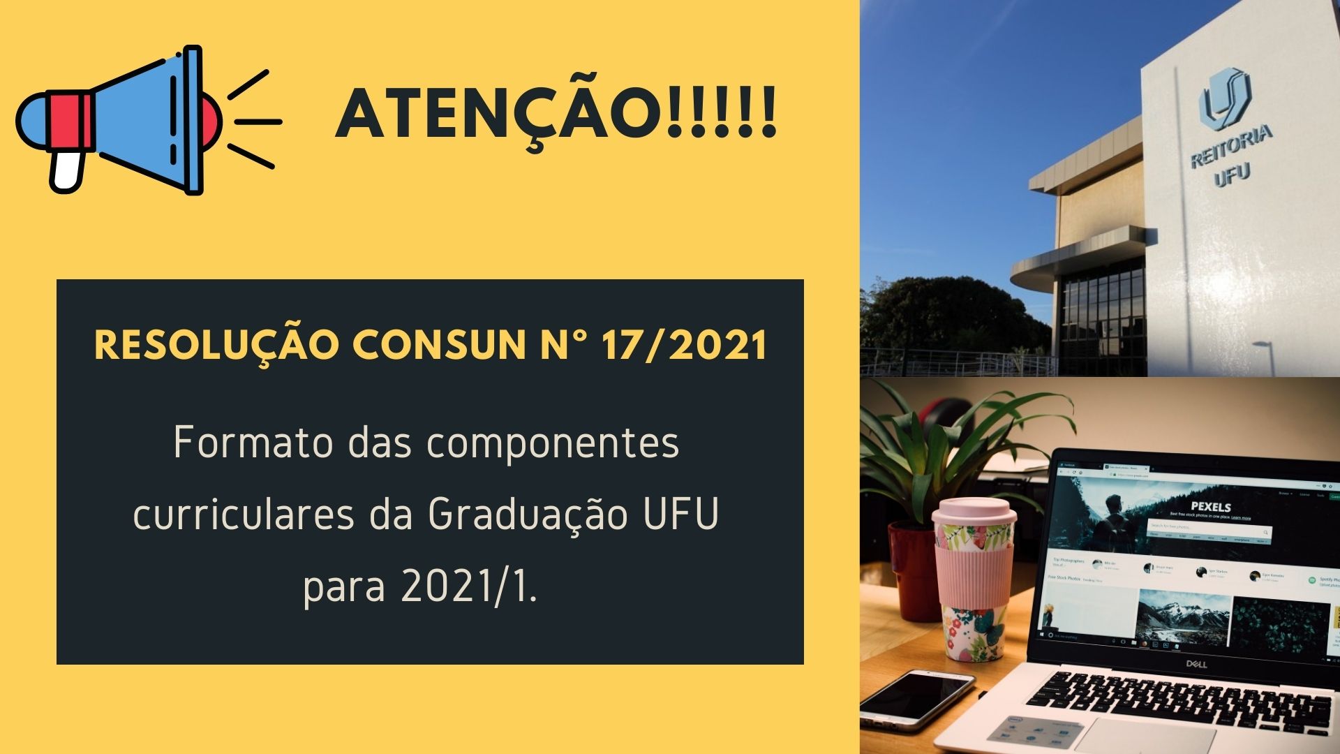 Verifiquem a Resolução do CONSUN no.17/2021 que dispõe sobre o formato da oferta dos Componentes Curriculares no âmbito do Ensino da Graduação da Universidade Federal de Uberlândia para o semestre letivo 2021/1.