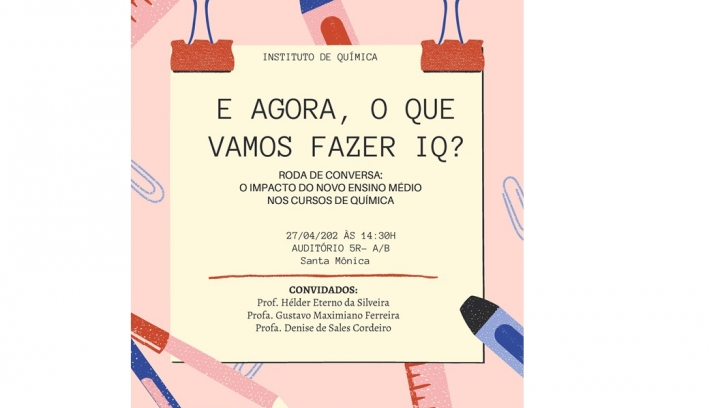 O objetivo desta roda de conversa é dialogar sobre o impacto das diretrizes atuais do Novo Ensino Médio, ou seja, a organização dos componentes curriculares na Educação Básica a partir da Base Nacional Curricular Comum (BNCC) e quais as consequências na matriz orçamentária do Instituto de Química.