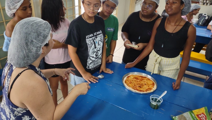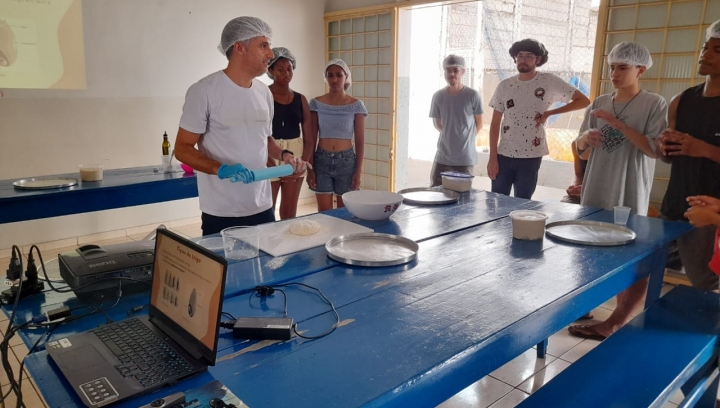 Esta ação, "Fermentação química: preparação de pizzas e empreendedorismo", Registro no SIEX 30164, partiu da problematização como atitude de interação com a realidade e a prática dos conceitos teóricos para experimentarmos a fermentação do trigo no preparo de pizza no projeto de Orientação e Formação do Adolescente no Lions Clube de Uberlândia Adolfo Alves da Silva. O projeto que cumpri o acordo de Cooperação Técnico- Científica entre UFU e Lions foi coordenado pelo Prof. Dr. Francisco José Torres de Aquino com colaboração da Profa. Dra. Elaine Kikuti e Prof. Dr. Alberto de Oliveira. Os membros da equipe executora foi formada por discentes do curso de Química industrial, Ane Cristine Rosa Pinto, Athirson Ruan Barbosa Lourenço, Laura Ferreira dos Reis, Katarina Facirolli Fukuhara, discente do curso de Licenciatura em Química, João Paulo de Menezes Pereira do projeto " Divulgação científica: há ciência em tudo o que comemos e bebemos" Registro no SIEX 27448 que é vinculado ao programa de Extensão do IQ-UFU, Programa interdisciplinar de formação e divulgação científica em Gastronomia Molecular, Registro no SIEX 28288.